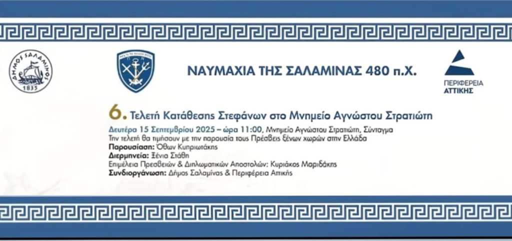 Τα «ΣΑΛΑΜΙΝΙΑ 2025» είναι μια ακόμα χρονιά εδώ για να μας θυμίζουν τους ηρωϊκούς αγώνες των προγόνων μας για την Ελευθερία και την Δημοκρατία. Στο πλαίσιο των επετειακών εορτασμών τιμής των Ηρώων αύριο Δευτέρα 15 Σεπτεμβρίου 2025 ώρα 11 π.μ. κορυφαίοι Διπλωμάτες Ξένων Χωρών στην Ελλάδα και Εκπρόσωποι Διεθνών Οργανισμών θα παρευρεθούν μπροστά από την Βουλή των Ελλήνων στην πλατεία Συντάγματος στο κέντρο της Αθήνας όπου και θα λάβει χώρα κατάθεση στεφάνων και επετειακές ομιλίες στο Μνημείο του Αγνώστου Στρατιώτη.