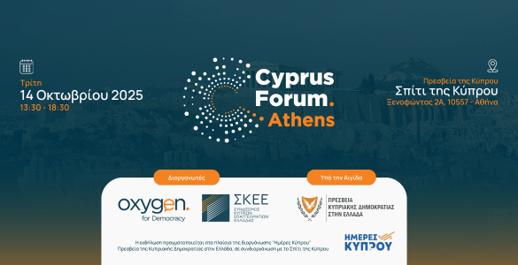 Μετά την επιτυχία του Cyprus Forum, του μεγαλύτερου συνεδρίου πολιτικής στην Κύπρο, το Oxygen for Democracy σε στρατηγική συνεργασία με τον Σύνδεσμο Κυπρίων Επαγγελματιών Ελλάδος (ΣΚΕΕ) ανακοινώνουν με ιδιαίτερη χαρά τη διοργάνωση του πρώτου Cyprus Forum Athens, που θα πραγματοποιηθεί στις 14 Οκτωβρίου 2025, ώρα 13.30 – 18.30, στo Σπίτι της Κύπρου, στην Πρεσβεία της Κυπριακής Δημοκρατίας στην Αθήνα. Το συνέδριο τελεί υπό την Αιγίδα της Πρεσβείας της Κύπρου και εντάσσεται στις «Ημέρες Κύπρου».