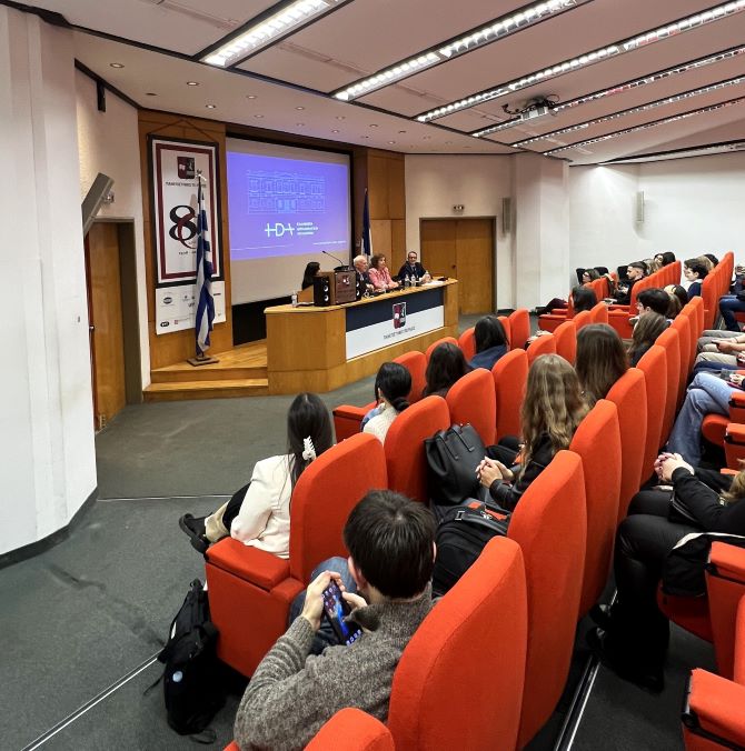 Το αμφιθέατρο, όπως αναφέρει η Ελληνική Διπλωματική Ακαδημία στα μέσα κοινωνικής δικτύωσης, ήταν κατάμεστο από φοιτητές και φοιτήτριες του προπτυχιακού και των μεταπτυχιακών προγραμμάτων του Τμήματος Διεθνών και Ευρωπαϊκών Σπουδών, που παρακολούθησαν με μεγάλο ενδιαφέρον την ενημέρωση για τον ρόλο του Υπουργείου και τις επαγγελματικές δυνατότητες που προσφέρει.