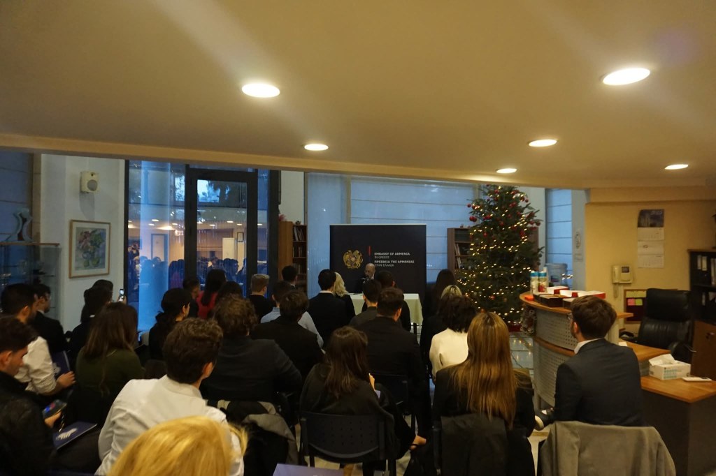 Ο Πρέσβης της Αρμενίας στην Ελλάδα, κ. Τιγκράν Μκρτσιάν, πραγματοποίησε συνάντηση με εκπροσώπους νεανικών και κοινωνικών οργανισμών που δραστηριοποιούνται στην Ελλάδα και παρέθεσε διάλεξη, συνοψίζοντας τα επιτεύγματα της εξωτερικής πολιτικής της Αρμενίας κατά τη διάρκεια του 2025.