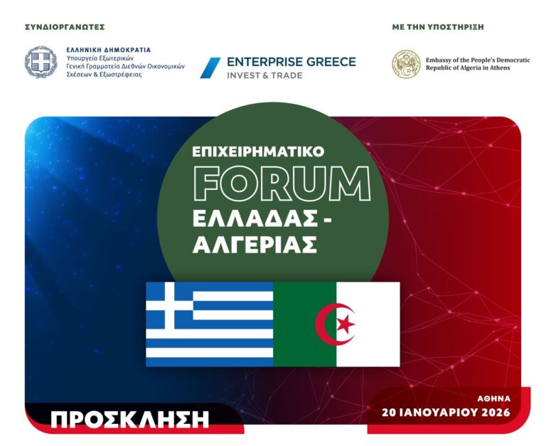 Η Γενική Γραμματεία Διεθνών Οικονομικών Σχέσεων και Εξωστρέφειας του Υπουργείου Εξωτερικών, σε συνεργασία με την Ελληνική Εταιρεία Επενδύσεων και Εξωτερικού Εμπορίου Α.Ε. (Enterprise Greece) διοργανώνουν Επιχειρηματικό Forum Ελλάδας – Αλγερίας, την Τρίτη 20 Ιανουαρίου 2026, στην Αθήνα.