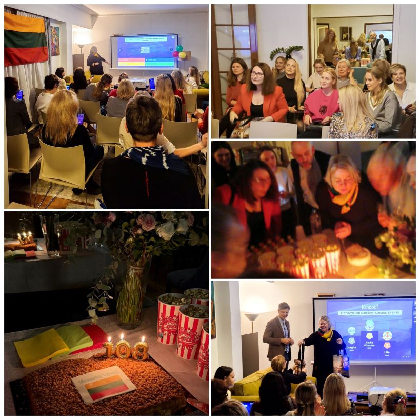 Το εορταστικό πρόγραμμα της εκδήλωσης, μεταξύ άλλων, περιελάμβανε, σύμφωνα με όσα ανέφερε η Λιθουανική Πρεσβεία στα μέσα κοινωνικής δικτύωσης, ένα αστείο κουίζ Λιθουανικής γλώσσας, την επετειακή τούρτα και την προβολή της Λιθουανικής κωμωδίας «Παρέλαση».