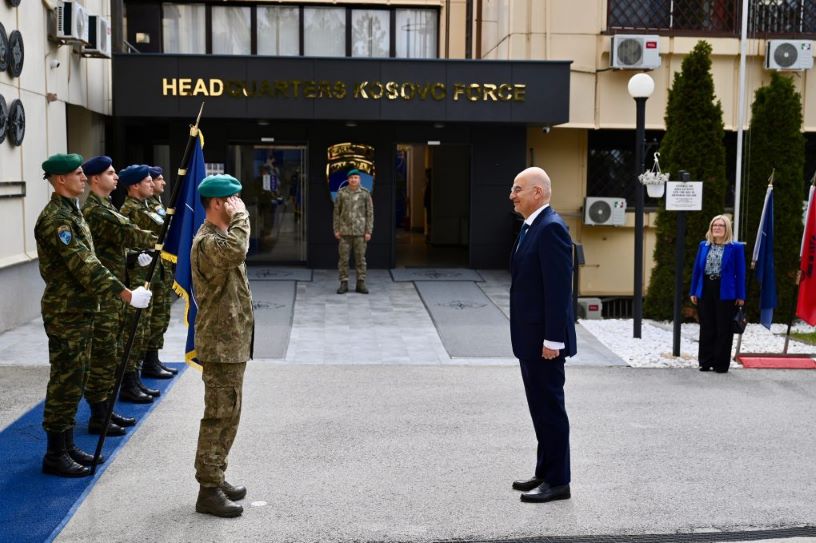 Μετά τη συνάντηση με τον Διοικητή της KFOR o κ. Δένδιας μετέβη στον χώρο συγκέντρωσης προσωπικού της ΕΛΔΥΚΟ, όπου τον υποδέχθηκε ο Διοικητής της Ταγματάρχης (ΠΖ) Σεραφείμ Κουτσομπλιάς.